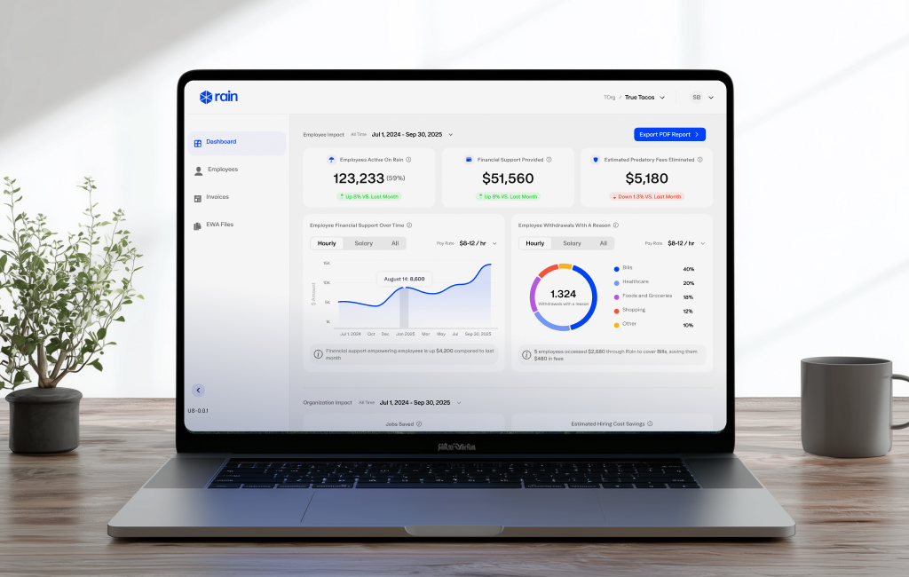 At Rain, this project went beyond a visual redesign. Over one quarter, we moved from discovery and strategic alignment with clients and leadership to validating and launching a new Employer Dashboard. The goal was to shift from passive reporting to a decision tool that proves how Earned Wage Access influences retention, tenure and absenteeism, positioning Rain as a strategic partner rather than just a benefit provider.